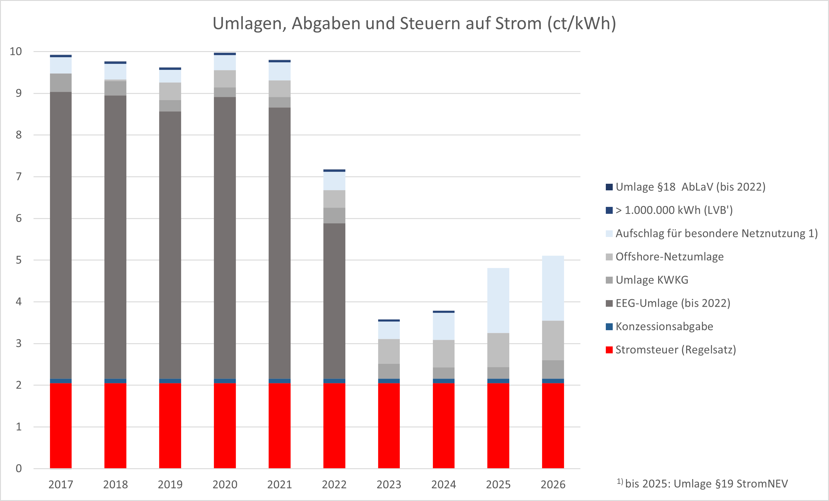 Die Belastung durch Umlagen steigt ab dem 01. Januar 2026 erneut leicht an. Merklich steigen die KWKG-Umlage und die Offshore-Netzumlage.